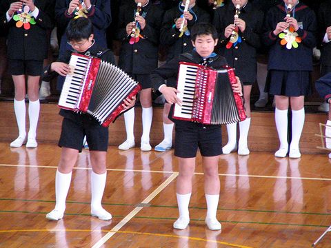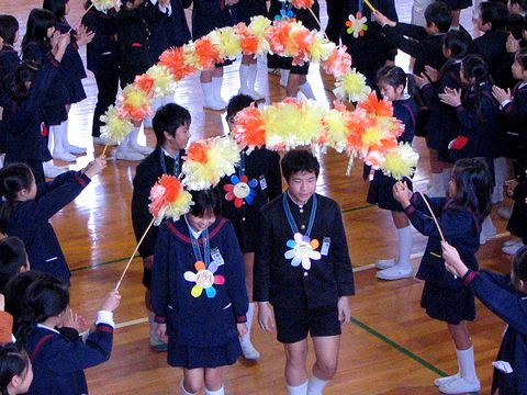 6年生を送る会でした。全くんはアコーディオンを演奏しましました。恒例のお花のゲートもありました。