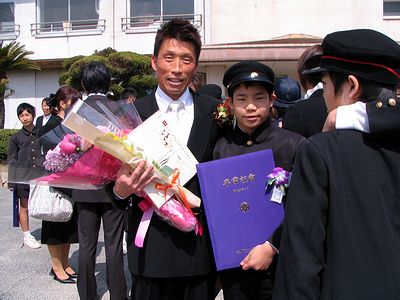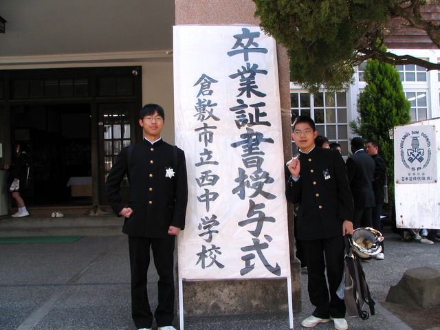中学校の卒業式でした。校長先生も感動された、よい卒業式でした。卒業生総代になった親友と一緒に記念撮影しました。
