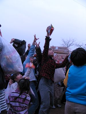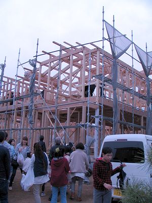 午前中は全くんの音楽教室の発表会でした(写真左)。午後は棟上げ式に招かれて餅まき/お菓子まきに初めて参加してお菓子をゲットした全くんです(中と右)。