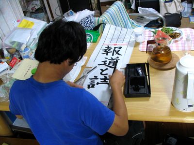 今日も午前中からお昼過ぎまで断続的に激しく雨が降りました。1週間前に梅雨明けが言われましたが昨日今日の雨が梅雨最後の雨ではないか?と思われます。写真は食後に書道の宿題をする三男です。広いテーブルは食卓しかありません。バイトに行っていてまだ夕食を食べていない長男のお皿も写っています。