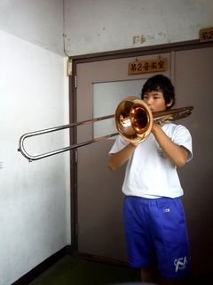 中学校は午前中のみの授業で午後は三者面談でした。三男は特に問題なく元気にやっているようです。面談のあとは部活を少し見学してきました。おとうさんの友人から3年の約束で借りたトロンボーンを吹いているところです。