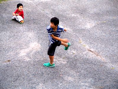 住んでいる宿舎で月一回の一斉清掃活動(草刈り)があり、そのあとで宿舎の子どもたちが前庭で野球を始めました(もちろん正式なものではありません)。久しぶりに三男も加わりました。写真は投手をしているところです。