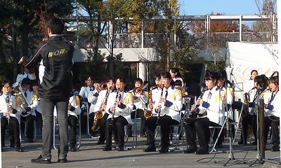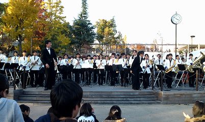 好天の下、西中吹奏楽部の舞台(写真左)、西中と東中の合同演奏の舞台(写真中)は多くの聴衆を集めて盛大かつ華やかに持たれました。写真右は演奏後の様子です。