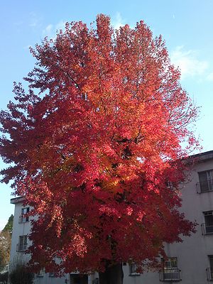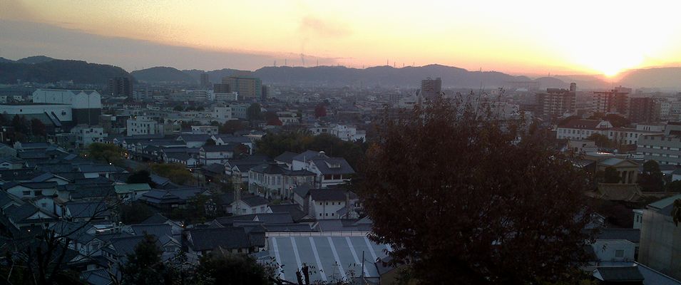 朝晩は5度を下回るほど寒くなりました。中学校で午前中吹奏楽の部活があった三男は、部活終了後に自転車で教会に向かう時、風を切って走るので寒かったそうです。宿舎まえのフウの木は紅葉の盛りです(写真左)。ちょうど青空に浮かぶ5日月が近くに見えたので一緒に写真に撮りました。どこにあるのかちょっとわかりにくいかもしれませんので、一部を切り取って強調してアップしたものをこちらに載せます。夕方はちょっと散歩して鶴形山から夕日に染まる倉敷美観地区を見ることができました(写真右)。