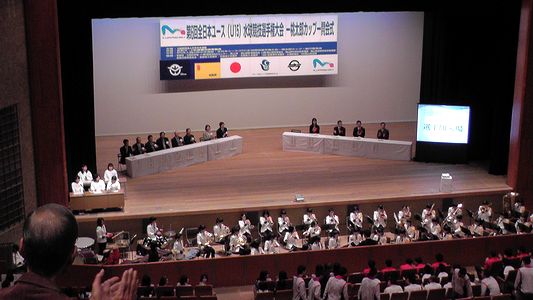 今日は倉敷市で開催される全日本ユース(U15)水球競技選手権大会(桃太郎カップ)の開会式で、西中学校吹奏楽部が演奏しました。ここ数年、西中吹奏楽部が招かれて演奏しています。我が家のすぐ近くの芸文館が会場で現地解散なので便利です。