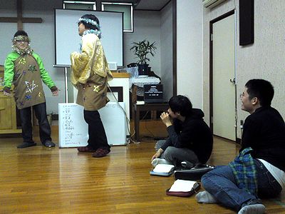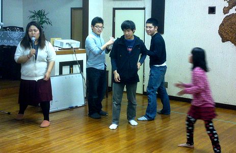 教会ではイースターでイエス様の復活をお祝いしました。子どもたちの集会でもゲームをしたり(左)、スキット(寸劇)があったりのプログラムでお菓子もたくさんいただきました。