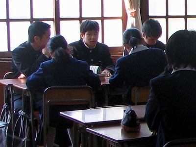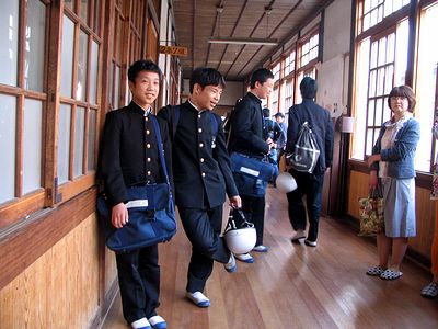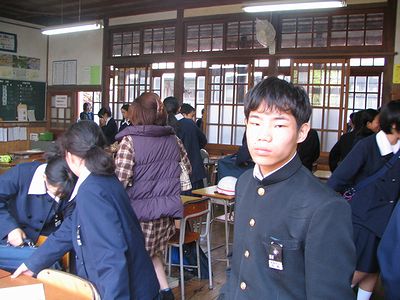 木造校舎での授業中および授業後の様子です。授業はグループを作って特別授業です。三枚目は吹奏楽でもヤマハでも一緒の同級生とともに。