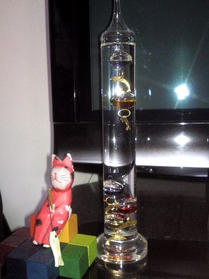 昨日も書いたように、冷房も暖房も不要な短い季節の間だけ、居間においてあるガリレオ温度計が機能してくれます。写真の状態だと約23度ということです。冷房が必要なくらい暑くなると浮きが全部沈んでしまうし、逆に暖房の時期の寒さでは全部上がってしまうのです。