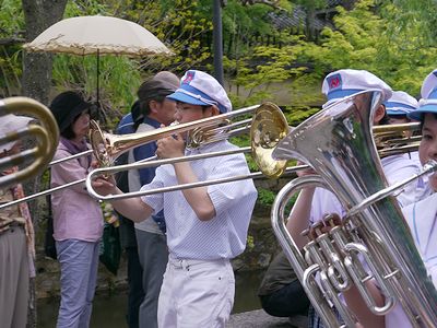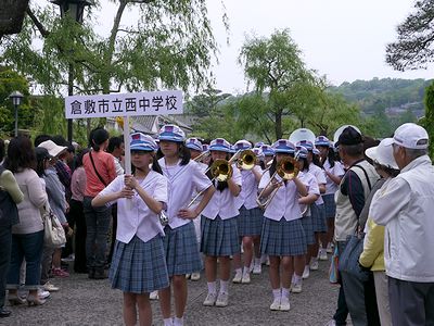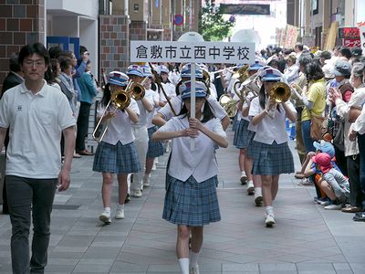 パレード前の倉敷駅北口ペデストリアンデッキでの音出し/リハーサル(上段)、アーケードでのパレード出発(中段)、パレード終盤の美観地区での様子(下段)です。まぁ上手に演奏できた、と本人の感想でした。