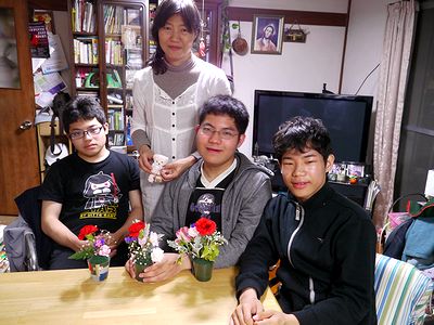 母の日です。子どもたちがJキッズで作成しておかあさんにプレゼントしたフラワーアレンジと一緒に、三男がプレゼントしたクマのマスコットを持ったおかあさんと記念撮影です。