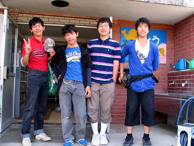 良い天気のなか、西小学校では運動会が行われました。三男も見に行き、5、6年生がする後片付けを卒業生として手伝ってきました(左)。片づけの最後に、どういうわけか卒業生代表として三男が指名されて5、6年生に向けて挨拶をすることになったそうです。突然の役目でびっくりしたけど、なんとか挨拶したそうです。右は何人かの卒業生と一緒の記念撮影です。