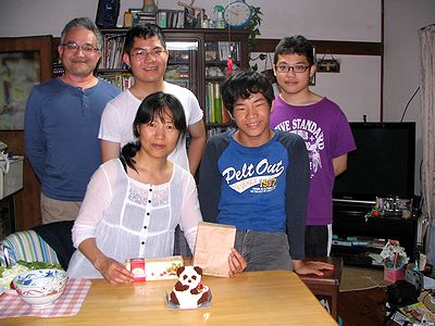 おかあさんの誕生日です。パチパチ!バースデーディナーのあとに、おじちゃん(おかあさんのおにいさん)や子供たちから誕生日プレゼントでいただいたパンダのケーキやお菓子と一緒に記念撮影です。