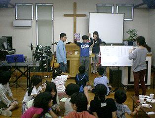 教会の子どもたちの集会キッズクラブでした。今月の目玉は「パンケーキを食べよう」ということで各自すきなトッピングをしてもらって何枚もパンケーキをいただきました(写真左)。聖書のお話をもとにしたスキット(寸劇、写真中)もあり、BINGOも(写真右)あって、30人くらいの子どもたちで2時間ほどの時を楽しく過ごしました。