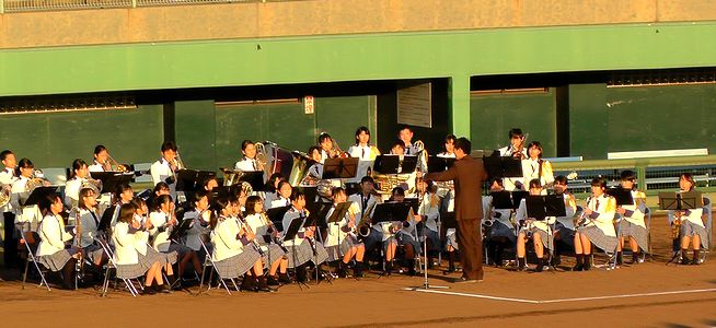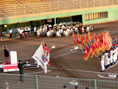 社会人の軟式野球西日本大会が倉敷で行われ、今日午後の開会式に西中学校吹奏楽部が招かれて演奏しました。