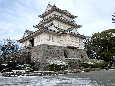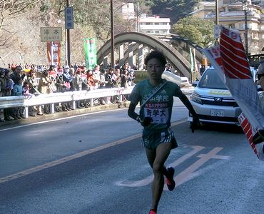 家族写真以外の帰省中の写真を3つ載せます。元旦は結構な雪が降りました。平塚のおばあちゃんのところを訪ねたあと、おとうさんが寄ってみた前鳥(さきとり)神社は雪のなかでした(写真左)。翌日になっても小田原城は薄く雪化粧をまとっていました(写真中)。2日は箱根駅伝を5区、箱根湯本で見ました。右の写真は湯本ではまだ2位でしたが、このあと一躍大スターになった青山学院大学の神野選手です。