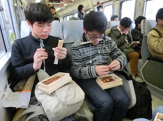 今年の元日におとうさん方のおばあちゃんと一緒に写したのが写真左、2日におじちゃんたちと一緒にレストランに行った時のものが写真中です。右の写真は3日の帰路、浜松駅で購入した鰻弁当(高いだけあって美味しかった!)を車内でいただいているところです。帰路も往路とおなじく青春18キップで11時間強かけて茅ヶ崎から倉敷まで走破しました。