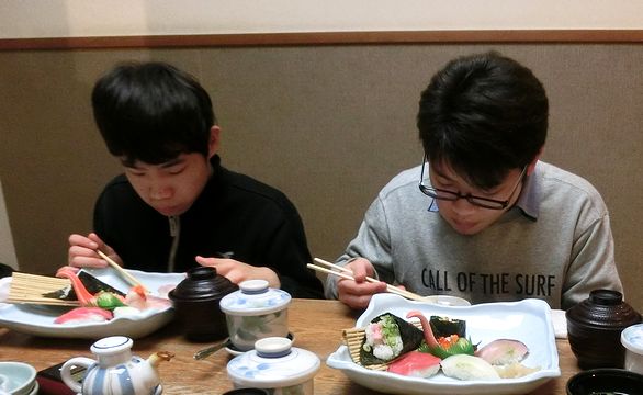 一昨日の成人式の日は、長男は中学の学年同窓会で旧友と夕食を楽しんできました。昨日はアルバイトだったので、今日家族で長男の成人式祝いの夕食をしました。本人の希望が寿司と言うことで、お寿司屋のコース料理でお祝いです。回る寿司ではありません。