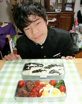 中学校の学校行事「自分で作るお弁当の日」で、今日のお弁当をつくることになった三男です。昨晩から準備して手作りハンバーグのお弁当を作りました。ケチャップをゼラチンでザリガニの形に固める細工も前の晩にしました。今日の次男の分のお弁当も三男が自分の分と一緒にやりました。