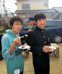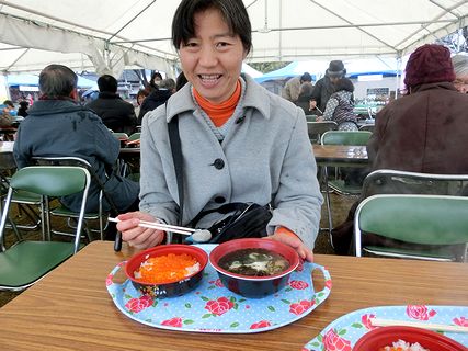 3月の倉敷は倉敷音楽祭のシーズンです。昨日今日と芸文館周辺では岩手、宮城、福島との交流イベントがありました。昨日、岩手県大槌町の虎舞を見せてもらい、大槌町のイクラ丼・魚汁セットをいただきました(写真)。部活や試験で子どもたちは忙しくて、おとうさん、おかあさんだけで行ってきました。この倉敷音楽祭のプログラムの一つで、今月22日にあるアマチュアトップコンサートというイベントに三男の所属する倉敷西中学校吹奏楽部も参加予定です。