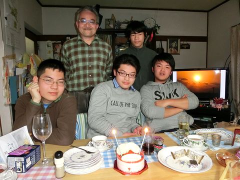 長男の誕生日です。20歳になりました。パチパチ!先輩もよんで夕食会をしました。バースデーケーキと一緒に記念撮影です。