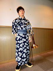 昨日、第29回倉敷音楽祭の行事の一つとして第29回倉敷アマチュアトップコンサートがあり、倉敷西中学校吹奏楽部も参加しました。三男をはじめ部員の何人かが和服姿で演奏しました。この浴衣はおばあちゃん宅からもらってきたもので、数日前から帯を締める練習をしました。草履は新調です。