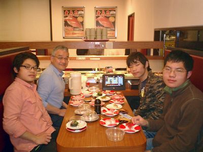 今週水曜日夜に無事に帰国しました。出張中におとうさんの誕生日があったので、数日遅れで今日は家族そろって回転寿司で誕生祝いの夕食です(写真撮影:おかあさん)。みんなよく食べるので、5人で会計は1万円を超えました。美味しいのは200円皿が多いのです。