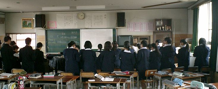 中学校の参観日でした。今日は音楽の授業でした。4月の第一回目の音楽の時間だったそうです。滝廉太郎の「花」を習って歌っていました(写真)。おとうさん、おかあさんの子どもの頃から「花」は中学3年で習うことになっています。