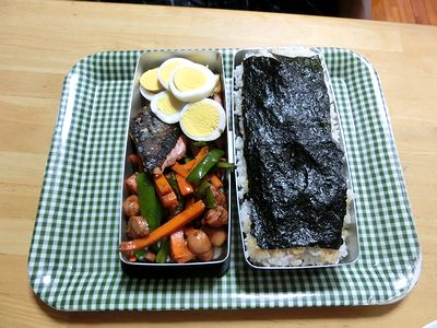 今週月曜日(6日)、中学生は自分でお弁当を作って持っていくという日でした。食育の一環ですね。写真左はおかあさんに手伝ってもらいながら三男が作ったお弁当です。生徒が自分で朝に手を動かして調理し、お弁当をつめるということなので、朝練は全校的にお休みです。
