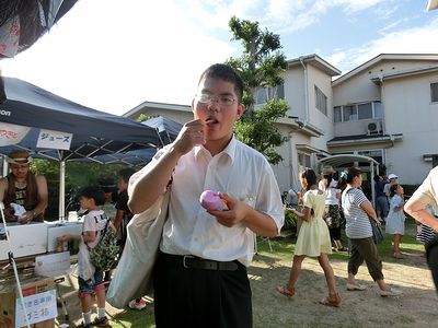 今日25日は倉敷天領夏祭りです。一昨年までは西中吹奏楽部が天領夏祭りで音楽隊パレードに参加していたのですが、昨年から吹奏楽コンクール地区大会と日程が重なるようになってしまい、西中は夏祭りの方は参加見送りになりました。今年は明日がコンクール地区大会、会場は真備です。夜に出店をひやかしに出かけました(写真右)。