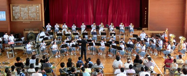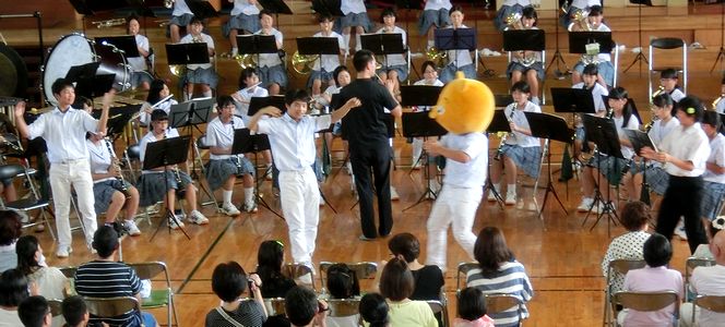 西中学校吹奏楽部は老松小学校区の夏祭りに出演しました。吹いて踊って、部員は大活躍です(写真)。次男の合唱部はNHK学校音楽コンクールの岡山大会に出場し、全校大会への出場権を得ました。