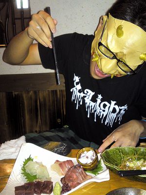 倉敷に残っているおとうさんと長男が昨晩は仕事、バイトとそれぞれ忙しかったので夜9時過ぎに夕食を外食にでかけました。お店で写真を撮るというと長男はカバンに入っていた般若の面をかぶりました。今日は焼き魚で自宅で夕食です。