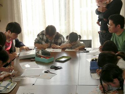 昨日の文化発表会(=文化祭)で三年生最後の舞台演奏をした三男たちです。演奏終了後は、本番と片づけで大汗をいたこともあり、バザーで販売されていた飲み物をおいしそうに飲んでいました。写真右は今日の教会キッズクラブのアクティビティーでプラバンの作製をしている次男、三男です。
