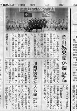 先週土曜日(19日)、合唱コンクール中国地区大会が鳥取で開かれ、次男の岡山城東高校合唱部は見事金賞と全国大会出場権を獲得しました。全国大会は10月24日に大宮で開催されるそうです。