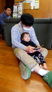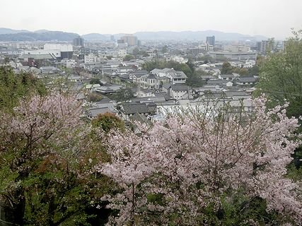 写真左は教会のロビーにて、礼拝が終わって午後のひとコマです。教会に来ている家族のあかちゃんが、三男になじんでいます。右は桜祭り最終日の鶴形山公園から我が家の方を望んだものです。散りはじめですが、まだ桜はありました。