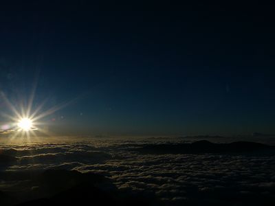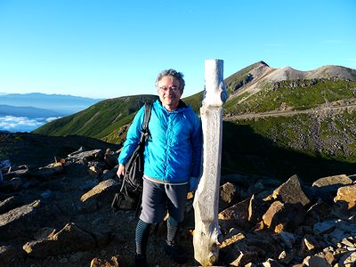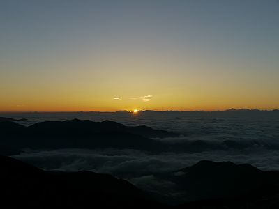 平湯温泉午前3時30分発の「ご来光バス」に乗り、幸運なことに雲海からの日の出を乗鞍富士見岳への登山道途中で見ることができました。たいへん良い天気で、遠くは立山や富士山(
