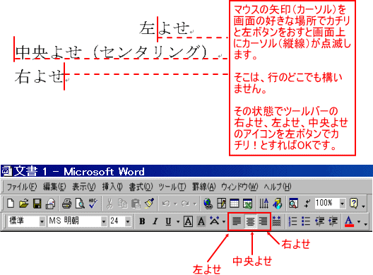 ※ここでは分りやすく、左よせ、右よせ、中央よせと表現します。