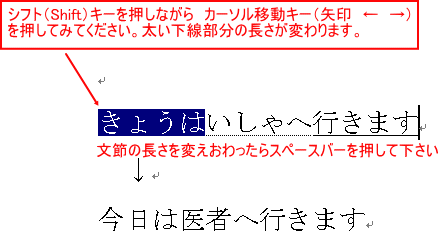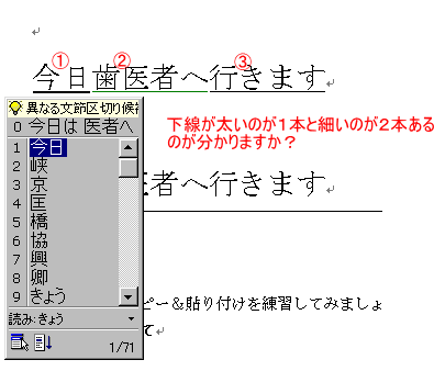 この状態でカーソル移動キー(← →)を押すと太い下線が