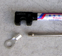 (^^;) 私が22sqの極太端子を処理する時の邪道な方法のひとつ。単純にハンマーで平たく潰すだけでは、端子が横に広がってしまうので、圧着の「圧」が足らないんです。そこで台座に、曲棒の頭の丸い部分を使えば極太端子ぴったりサイズなんですね。ここに端子をはめ込んだ状態で、いらなくなった激安1/4インチソケットハンドルの四角い頭を使って、大きなハンマーでそりゃもうガンガン・・端子にめり込むぐらい・・ガンガン潰します(^^;) 四画な凹みの端子になって見た目は圧着工具っぽく?