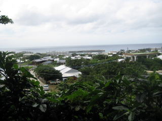特攻花の見つめる先に広がる喜界島中心部・湾(わん)地区。