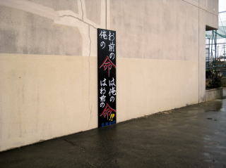 八重山高校の校舎に立てかけてあったフレーズ。「お前の命は俺の命!! 俺の命はお前の命!!」