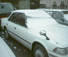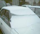 なんだ? 誰かあっしの下駄(車)のフロントガラスに白い布団を掛けてったの? いえ違います。これは雪なんですよぉ