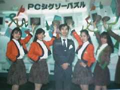 この写真は1日が終わり、会場の後かたづけをしている時にコンパニオンのお姉さんたちと記念撮影したものです。コンパニオンの皆さんもお疲れでしょうに、ポーズを決めてくれました。6人だったか7人だったか忘れましたが、皆さんまじめに仕事をこなしていました。