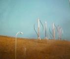 - なんだ? サンフランシスコからヨセミテ公園へ向かう観光バスの中から撮りました。山の上に見慣れない物が何百、何千と並んでいます。手前の道路を走るトラックと比べて見ればわかると思いますが結構大きな物です。これは風車なんですねぇ。風車で電気を作っているのです。究極のクリーンエネルギーですねぇ。