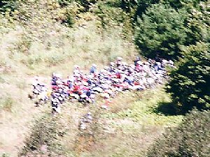 | ちょいと3〜400m走ると何やら渋滞中。 一気に幅が2〜3mと狭くなって、殆どの人が苦も無く 行ける登坂なんだけれども、台数が多いだけに1人が こけると、このありさま。 |