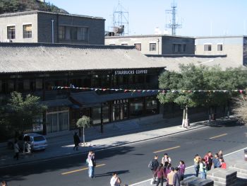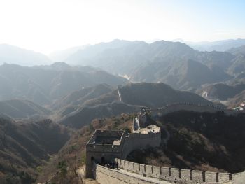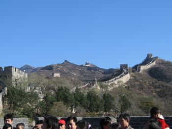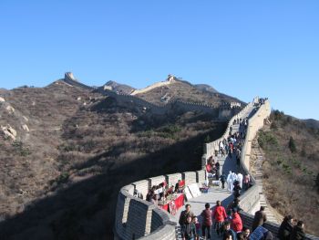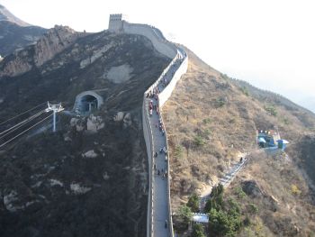 八達嶺長城です。左側にロープウェイが有ります。 右側はロープウェイを降りて長城に入る入口です。 |