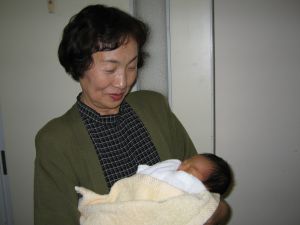あーちゃん(祖母の呼び名) に抱かれています。 史子は初孫なので、みんなが喜んでくれて良かった! |