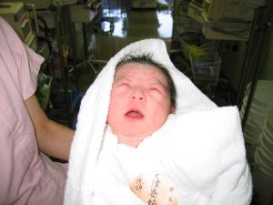 | 明け方、安産で史子が誕生! (といってもまだ名前はついていませんでしたが(笑)) 生まれたての赤ちゃんって、 ホントお猿さんみたいでした。 |