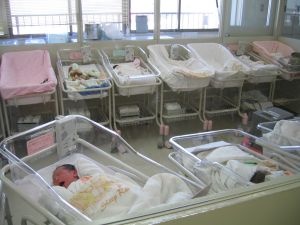 | 新生児室の様子。手前左が史子。 | 産後2時間のお母さん。 ちょっとやつれてるかな? |