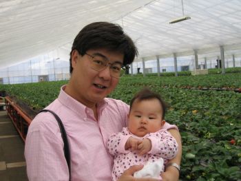 イチゴ狩り。お父さんと一緒に。