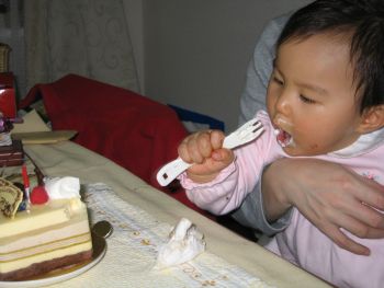 | 自分で取って・・・。 | 自分で食べる。 でも、口の周りはクリームだらけ・・・ |